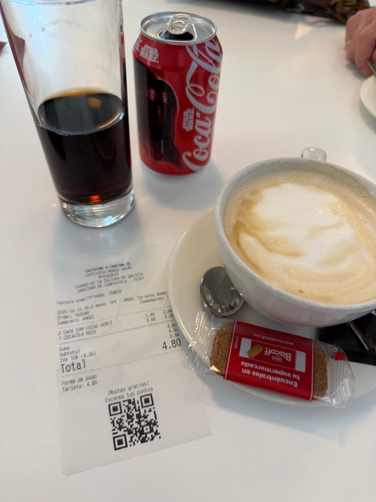 Ein Abstecher führte uns noch in die Kultur-City auf einem Hügel. Die Gebäude wurden von Peter Eisenmann entworfen und beherbergen u. a. die galicische Bibliothek und ein Museum. Allerdings scheint hier alles irgendwie ausgestorben zu sein. Wenigstens einen sehr günstigen Kaffee bekamen wir in der Kantine 🤣