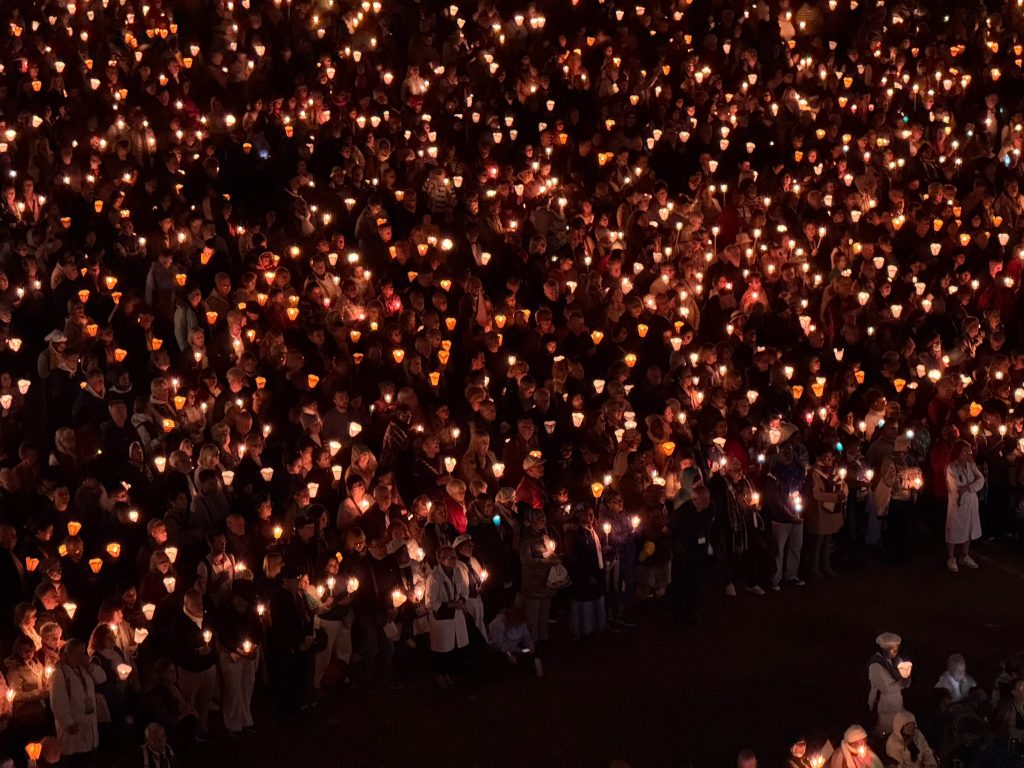 Beim letzten Mal haben wir die allabendliche Lichterprozession ausgelassen, weil es in Strömen geregnet hat. Heute haben wir sie, bei bestem Wetter, angeschaut – ist schon beeindruckend. Ein paar Fläschchen Wasser haben wir auch mitgenommen – wer weiß, wofür es gut ist 😉