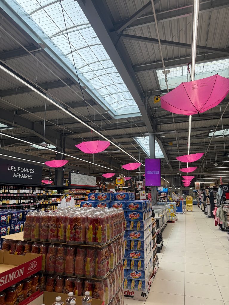 Weiterhin verfolgen wir das Projekt „mautfrei durch Frankreich fahren“. Unterwegs kaufen wir noch im Intermarché von Auch ein (ja, so heißt die kleine Stadt mit der großen Kathedrale 😉). Im Supermarkt wird auch auf den „Octobre rose“ aufmerksam gemacht.