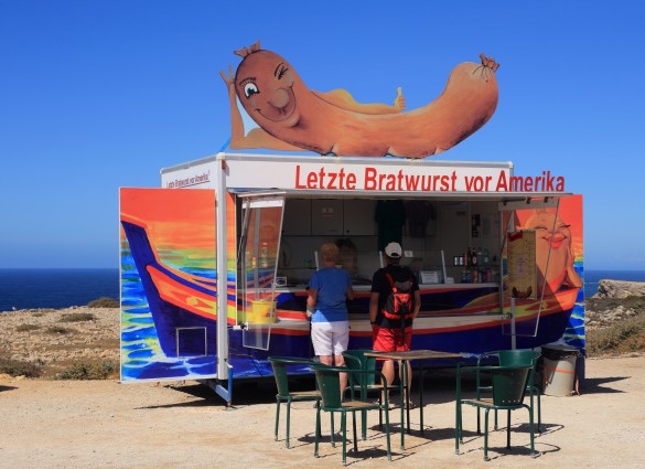 Weiter fahren wir auf schmalen, mit diversen Schlaglöchern versehenen, Straßen Richtung Algarve. Dort ist unser Ziel: das Cap von São Vicente, der südwestlichste Punkt des europäischen Festlands. Hier gibt es normalerweise eine sehr berühmte Bratwurst, aber leider schloss die Bude am vergangenen Wochenende für die Winterpause. Wir loggten wenigstens den südwestlichsten Geocache Europas. Aktuell war nicht so viel los, aber man kann sich gut vorstellen, dass sich die Menschen in der Hochsaison hier stapeln.