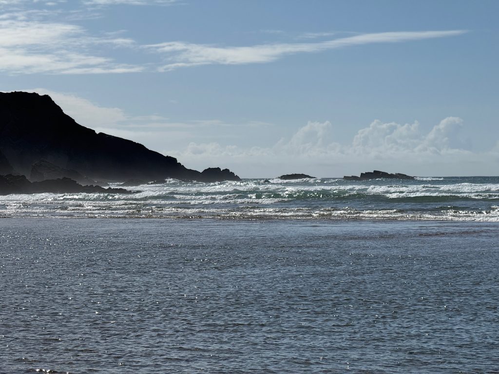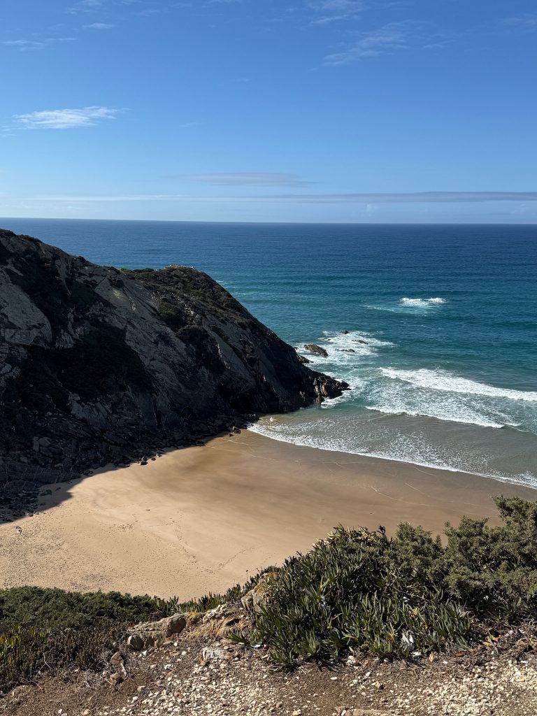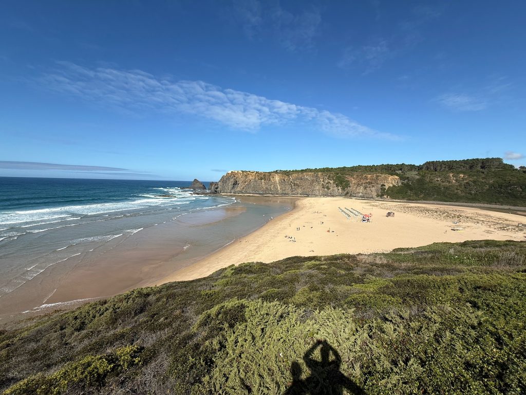 Weiter geht’s, über die Landstraße, Richtung Küste. Unsere Mittagspause machen wir an einem wunderschönen Strand in Odeceixe, direkt am berühmten Fischerweg. Wir treffen auch jede Menge Menschen mit Rucksack, die den Fernwanderweg laufen. Marcus hält die Füße ins Wasser – weiter müssen wir nicht in den kühlen Atlantik eintauchen. Ein paar Mutige schwimmen so richtig – wir gönnen uns lieber einen Kaffee in der Bar.